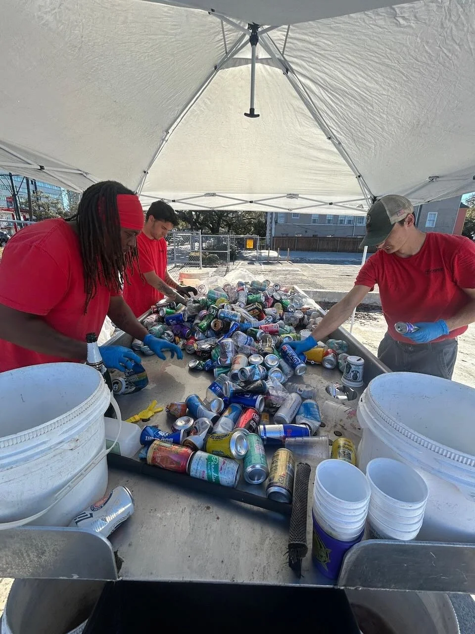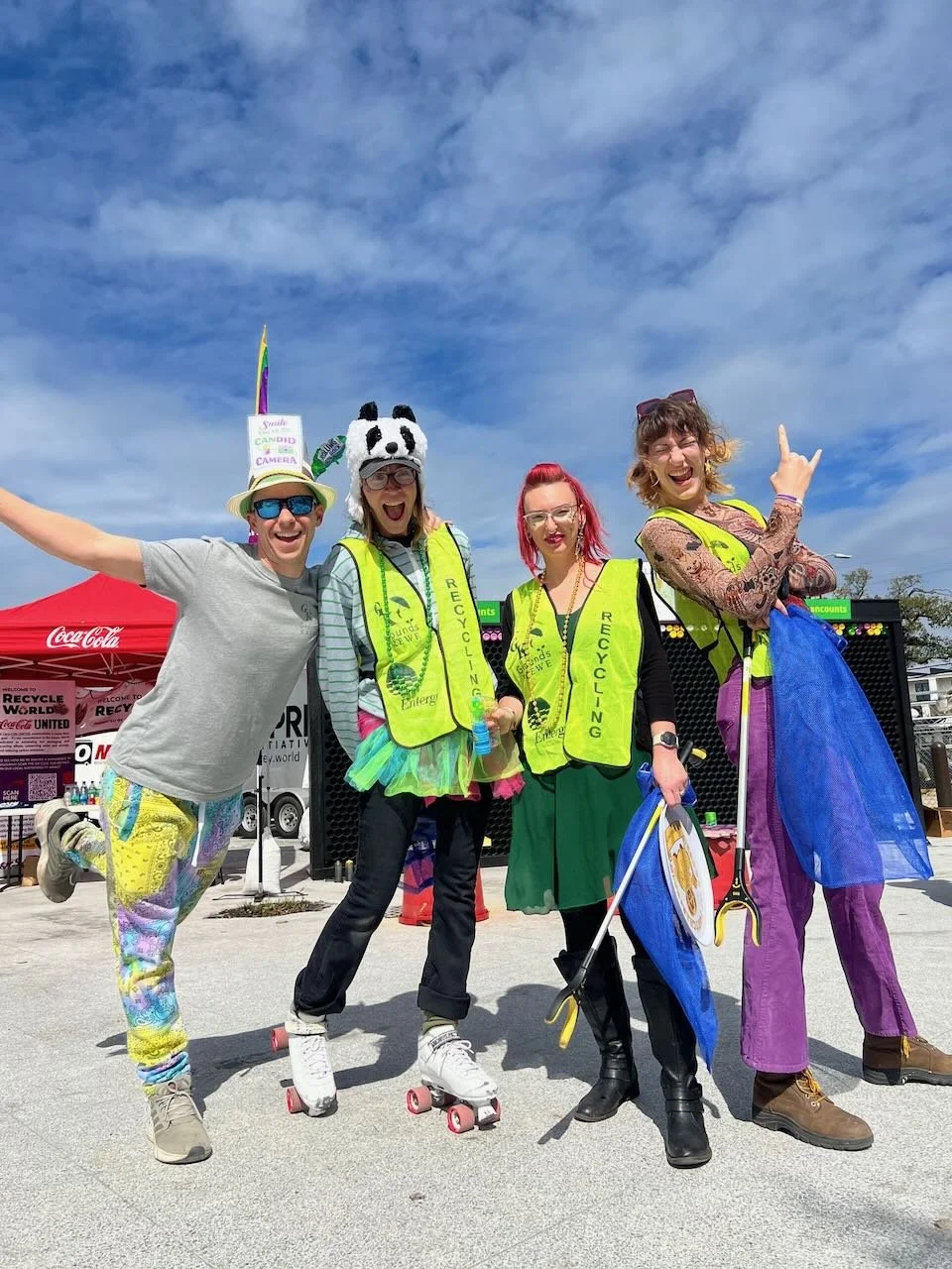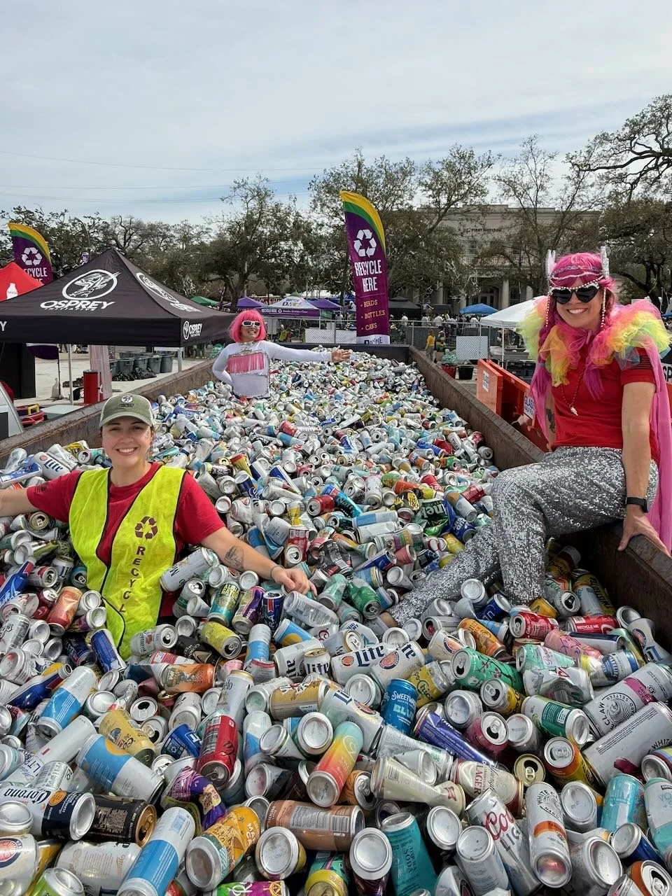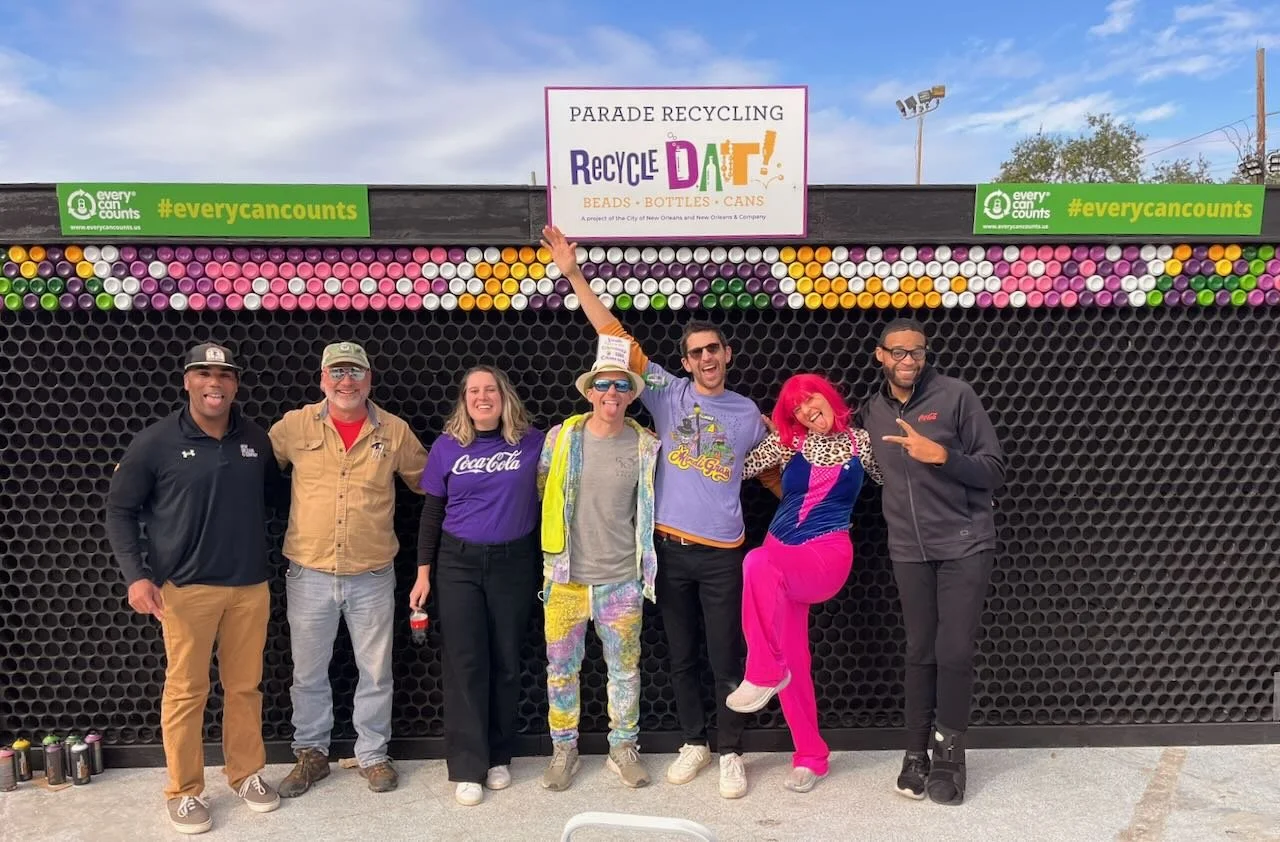 The epicenter of Recycle Dat! 2025 on the corner of St. Charles & Louisiana Ave. engaged the parading public with displays of the waste sorting process, accumulated recyclables and aluminum can mosaic art wall installation.